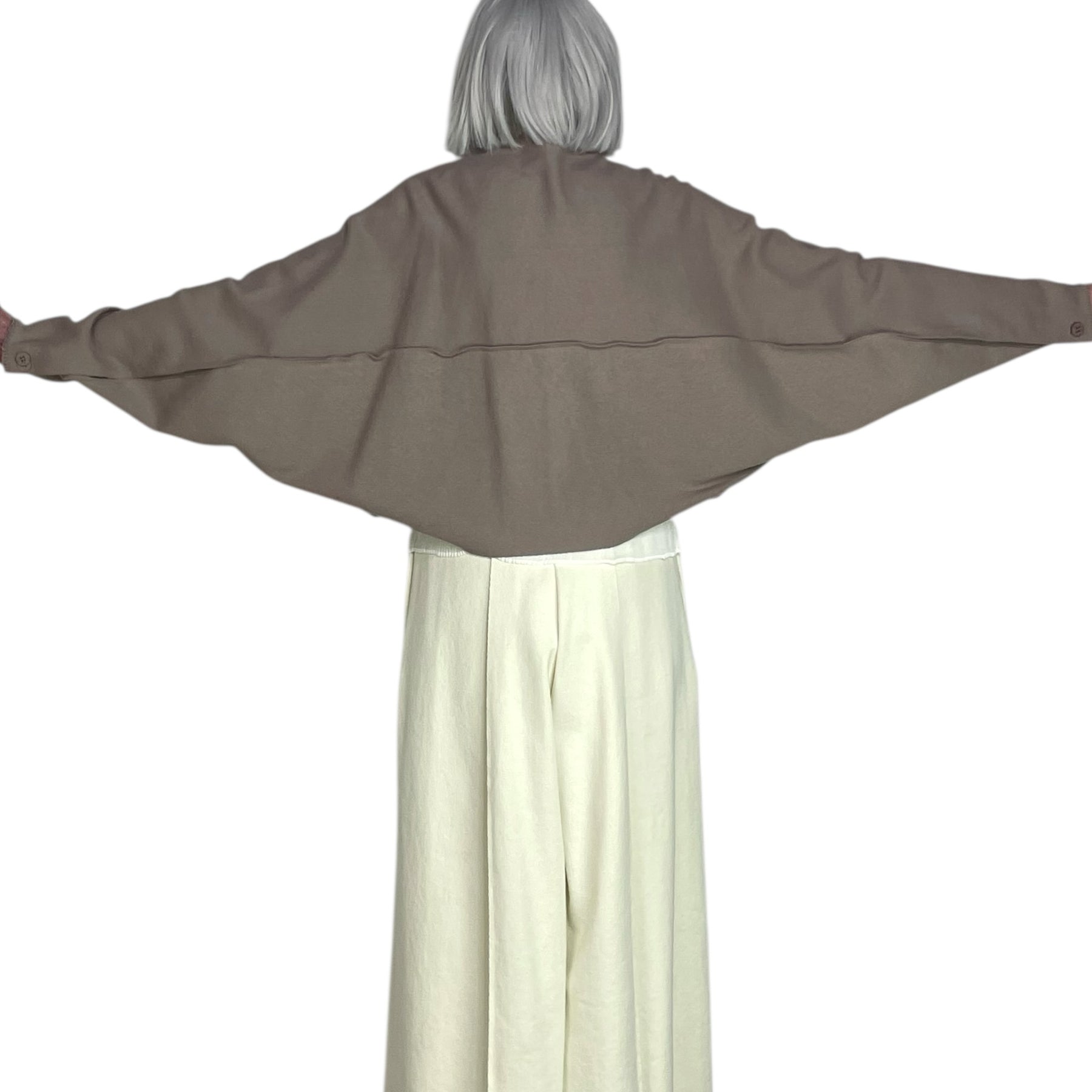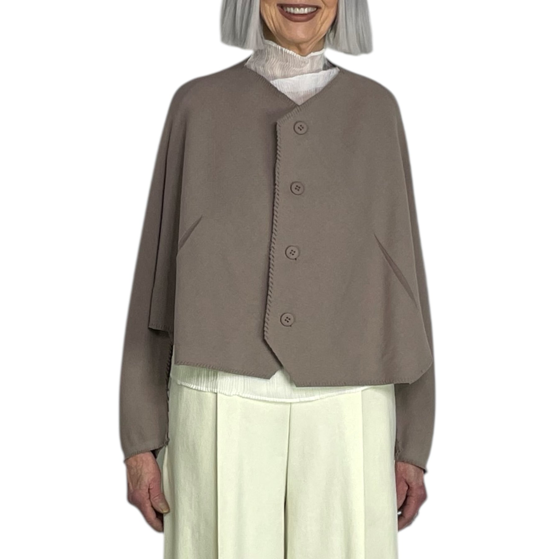 Knit cropped button front collarless jacket. Two front slit pockets, long sleeves with button at cuffs. Mini-fringe cut edge detailing.