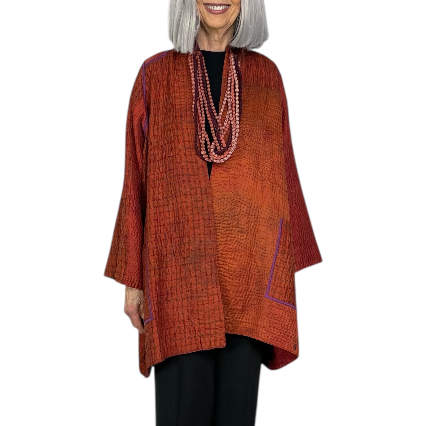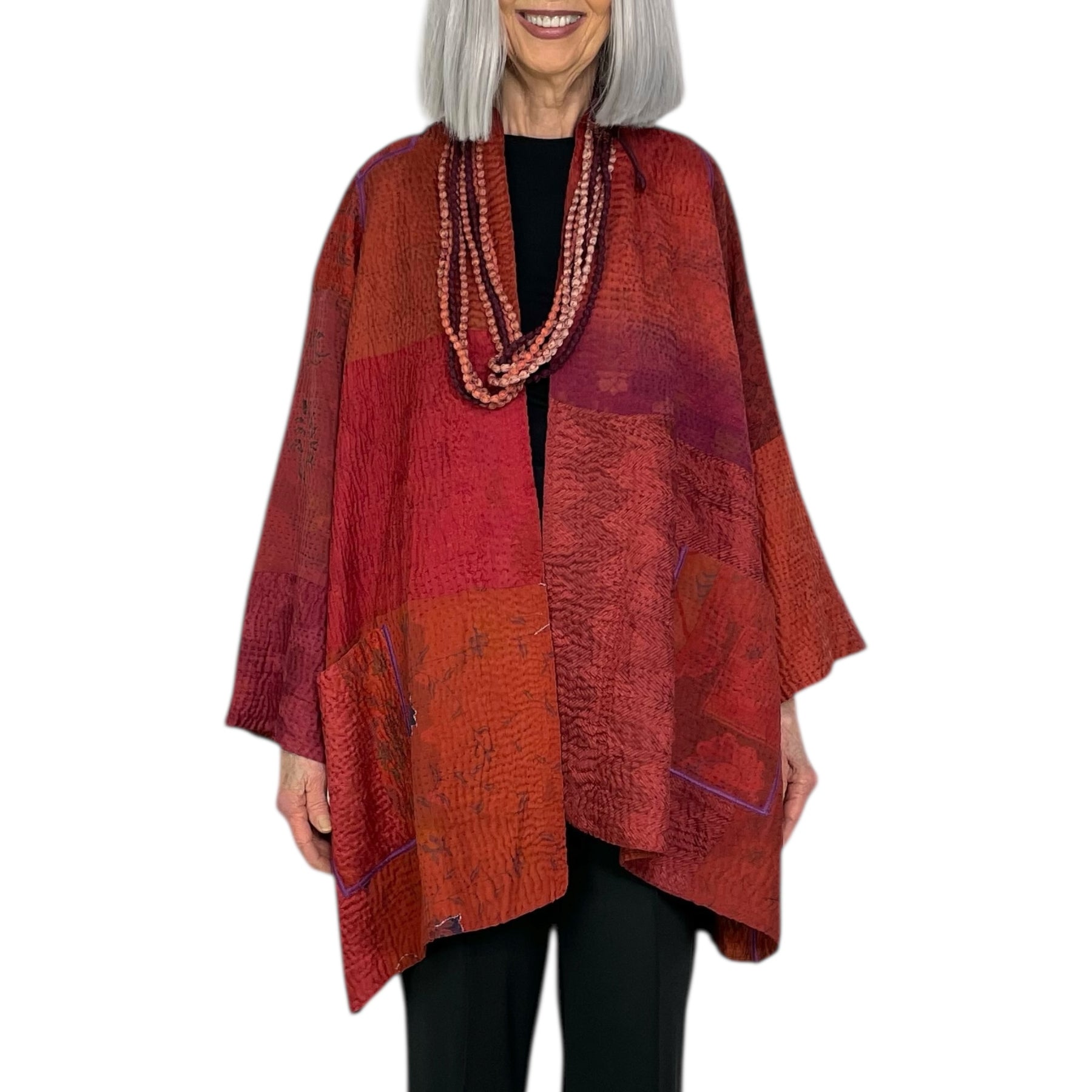 Reversible vintage silk georgette and vintage silk patch open front jacket with a kimono collar and long sleeves. Patch pockets on both sides. Medium weight, 4-layer vintage saris with hand stitching throughout. A-line shape, relaxed fit.