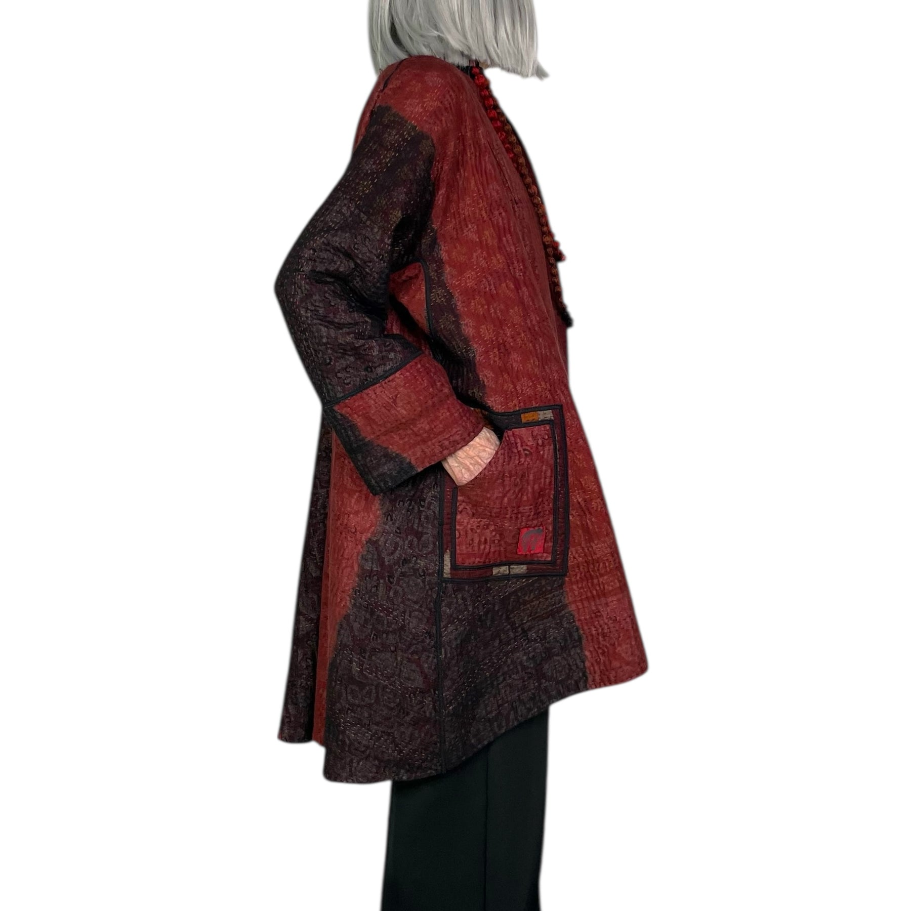 Reversible kimono collar jacket with long sleeves and an A-line silhouette.  On-seam pockets on front, patch pockets on reverse.  4-layer vintage saris with hand stitching throughout.  Relaxed fit.
