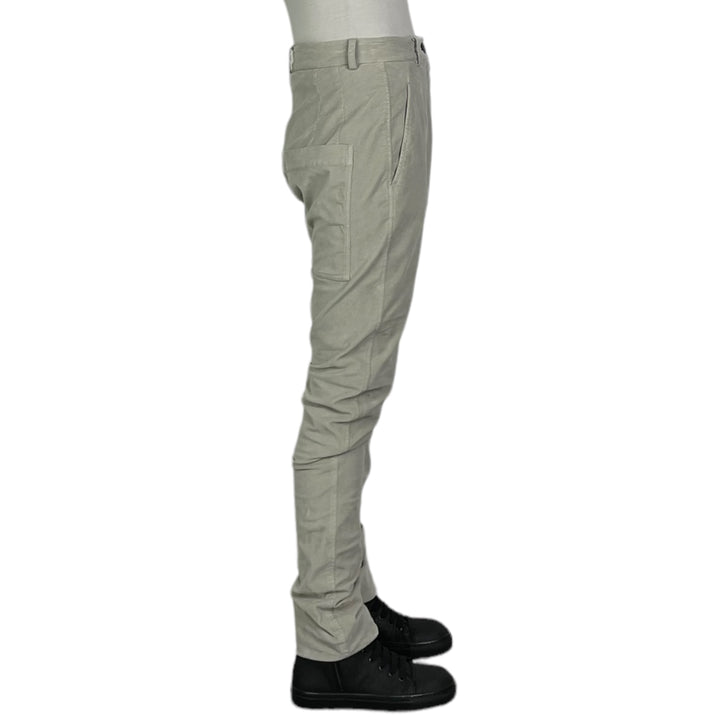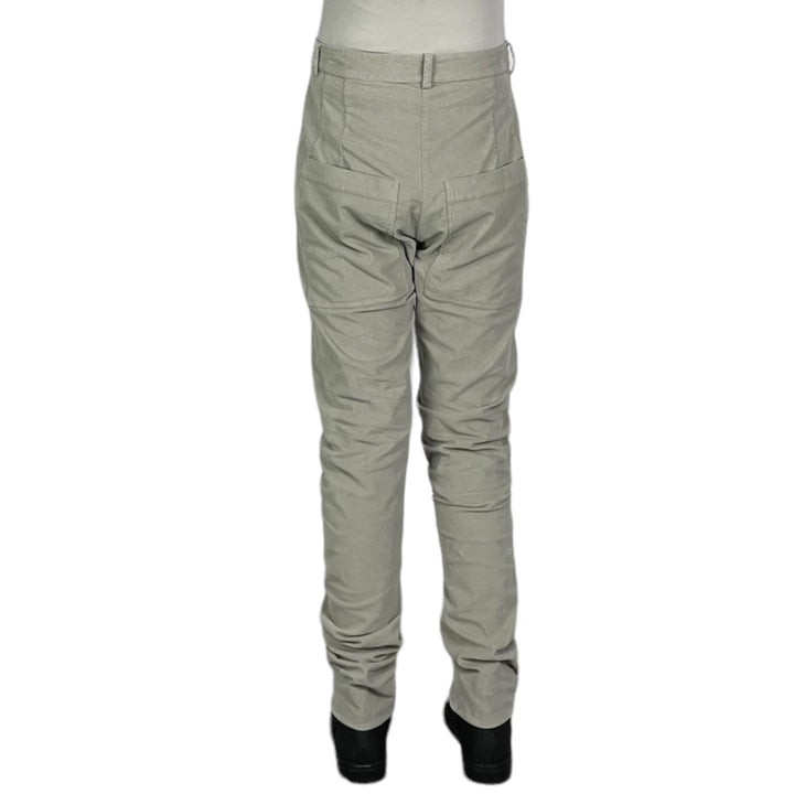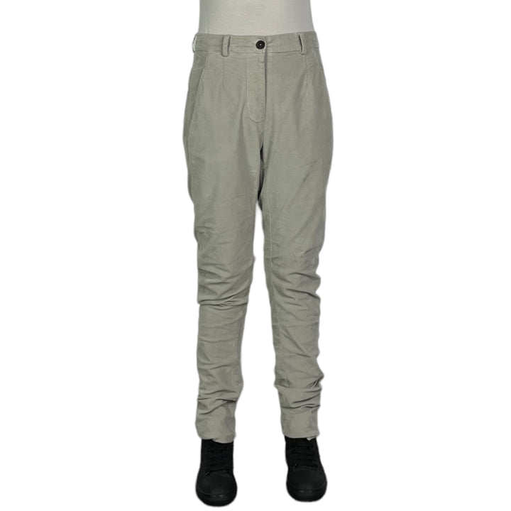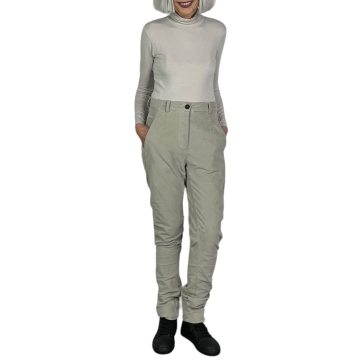 High waisted velveteen pant with button fly front and belt loops. Two front slant pockets, two back patch pockets. Extra long slim leg, meant to be ruched at ankles.