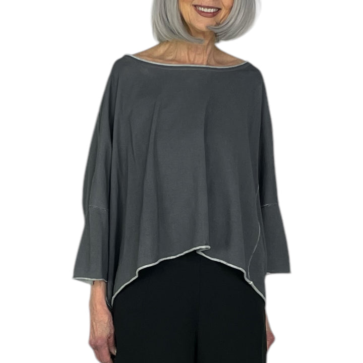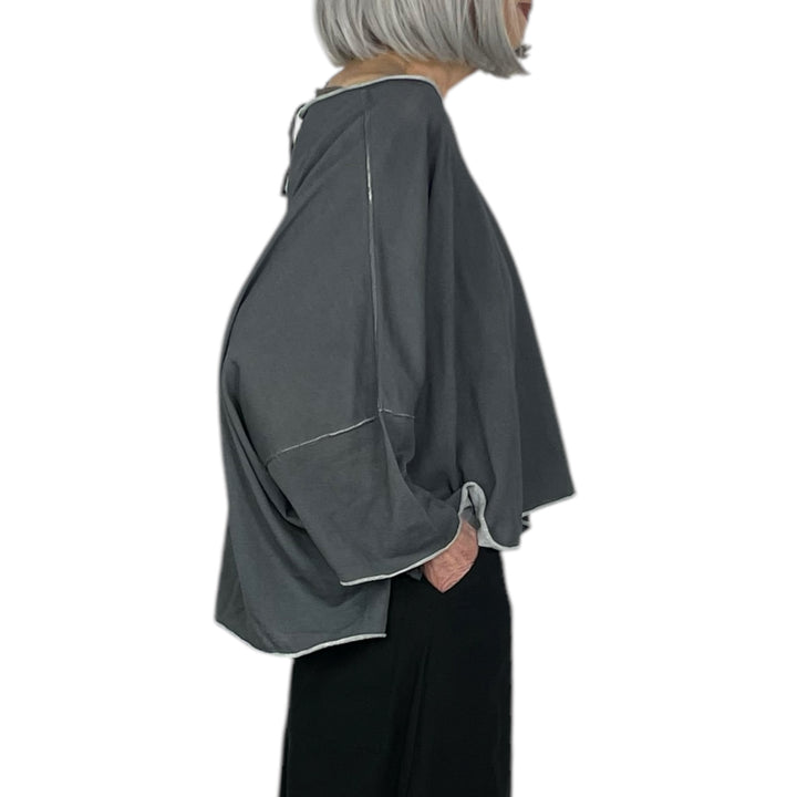 Lightweight cotton knit pullover with a wide crew neckline and short sleeves. Wide, boxy silhouette with side slits and raw rolled edge detailing. Also shown worn inside-out for a reverse color-way.