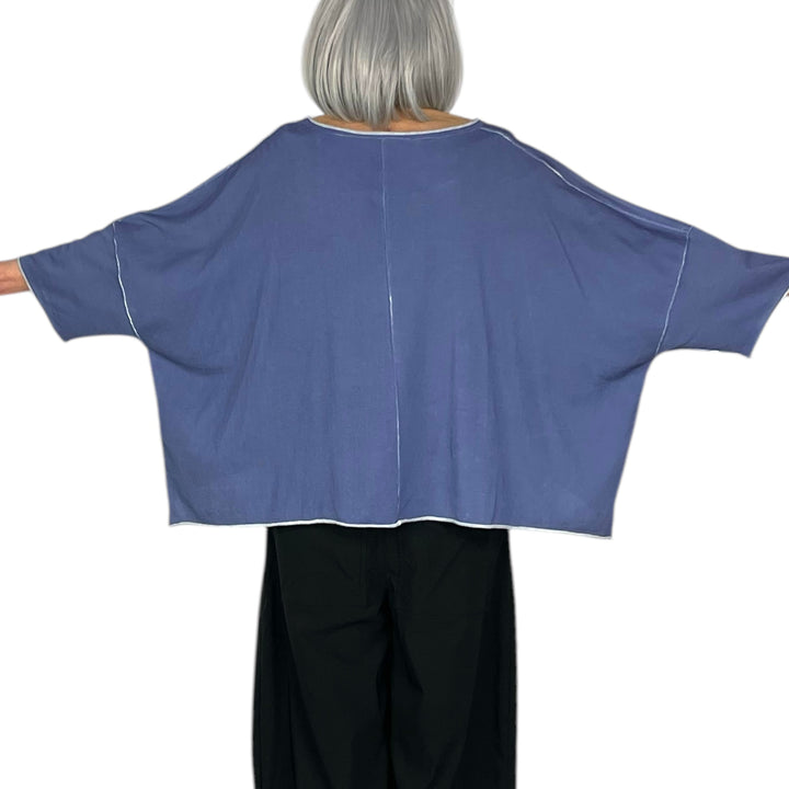 Lightweight cotton knit pullover with a wide crew neckline and short sleeves.  Wide, boxy silhouette with side slits and raw rolled edge detailing.  Also shown worn inside-out for a reverse color-way.
