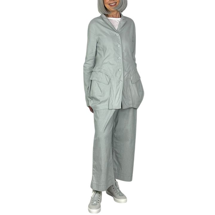 Long sleeve jacket with notch collar and button front closure. Two front flap pockets at exaggerated hips. Slits at cuffs.