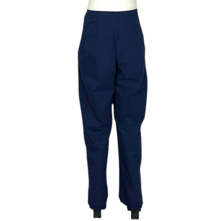 Wide leg trouser with elasticized waistband. Two side pockets and two back patch pockets. Side slits at mesh trimmed hemline.
