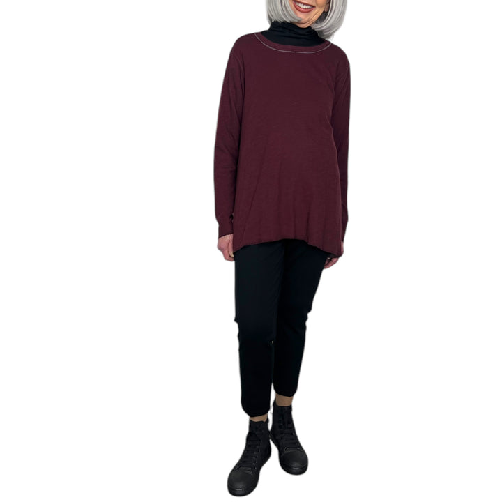 Long sleeve crew-neck t-shirt with drop shoulders. A-line shaped, double layers with raw serged cuffs and hemline.