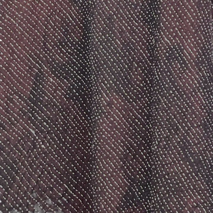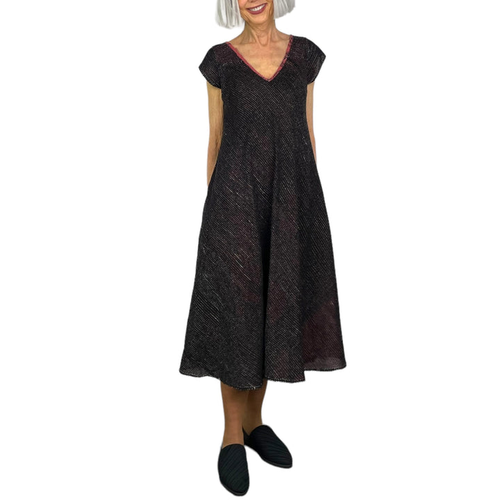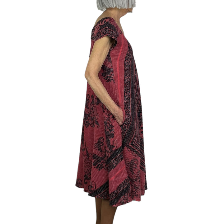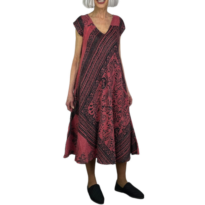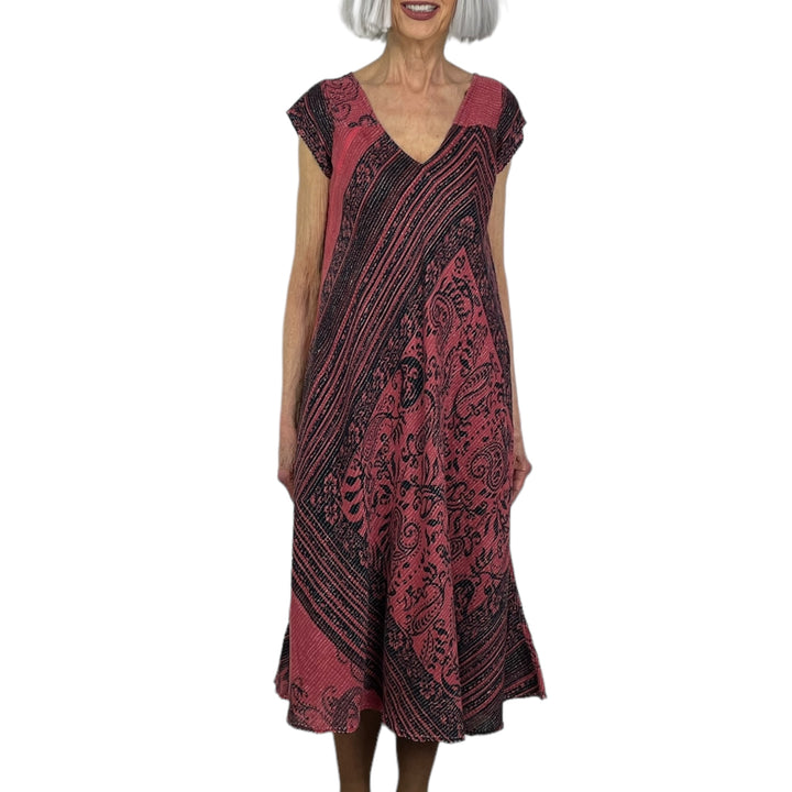 Reversible A-line dress with a double V-neck neckline and cap sleeves. Welt pockets on front, patch pockets on reverse. 2-layer vintage saris fabric with hand stitches throughout. Front is cotton print, reverse is over-dyed vintage cotton. Relaxed fit.