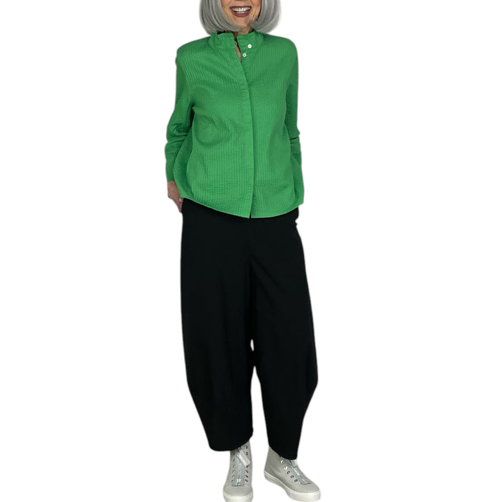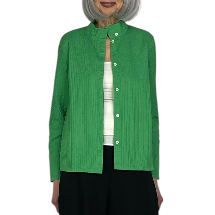 Long sleeve shirt with a concealed button front, stand collar and straight cut. Signature hand-worked pintucking.