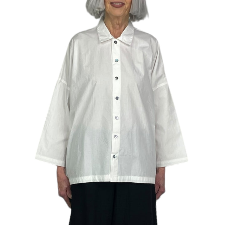 Button front crinkle cotton shirt with a small collar. Wide silhouette with drop shoulders and side slits.