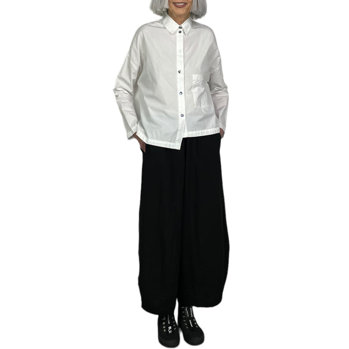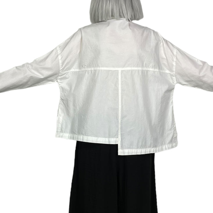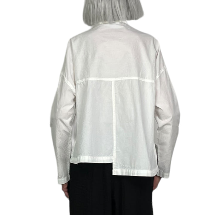 Button front crinkle cotton shirt with a small collar and uneven hemline. Drop front patch pocket, side slits.