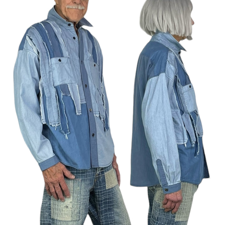 Mixed fabrics button front shirt with two button breast pockets and button cuffs. Mixed fabric raw edge strips on front. Loop detail at back yoke.