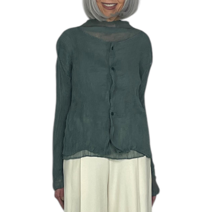 Twist pleated button front shirt/cardigan with a round neckline and long sleeves.