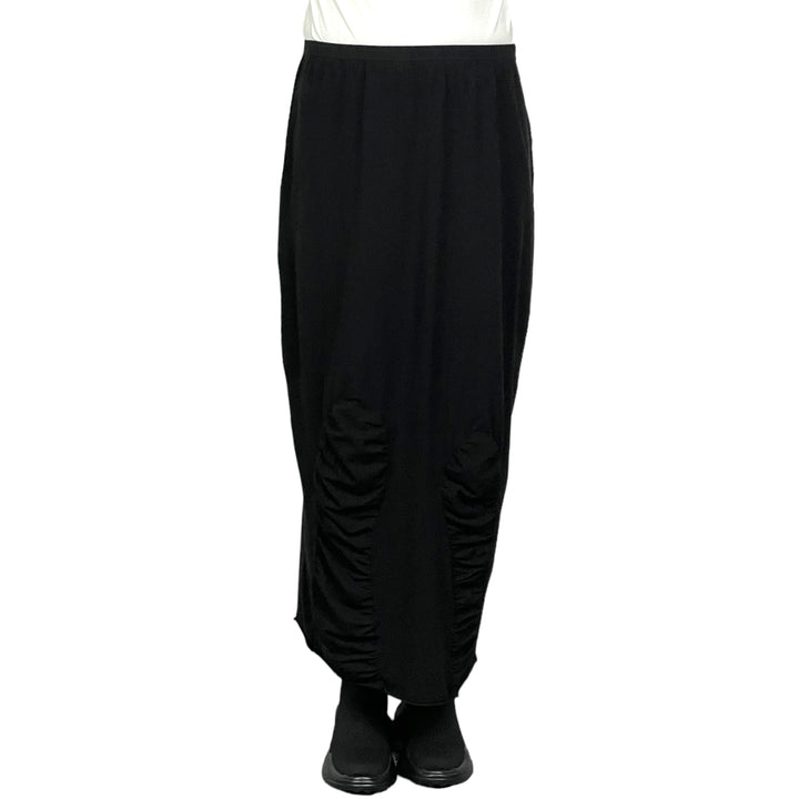 Long slim jersey pull-on skirt with elasticized waistband and shirred panel inset detailing.