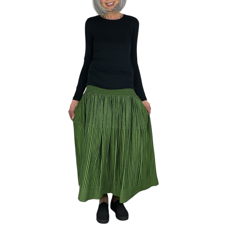 Woven full pull-on skirt with shirred top panel and elasticized waistband. This fabric was woven using technology developed by Nuno.