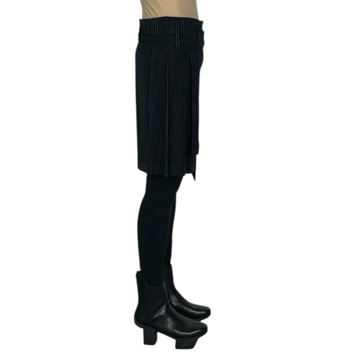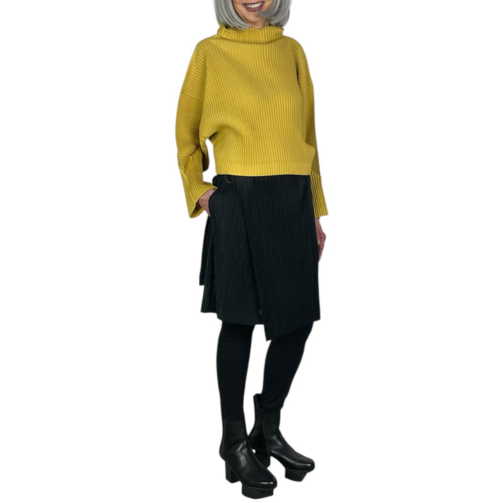 Unisex pleated wrap skirt with adjustable strap and D-ring at elasticized waistband. Two side pockets, integrated belt with belt loops at back waistband.