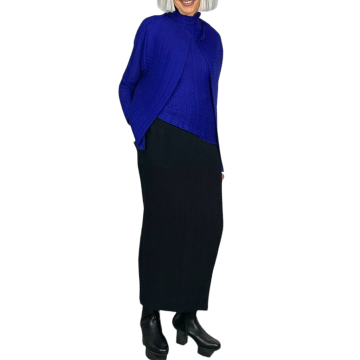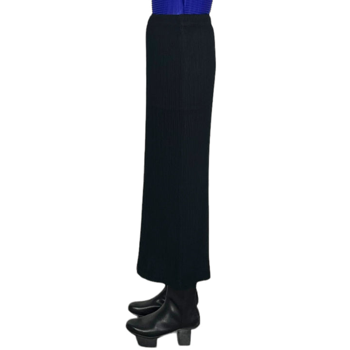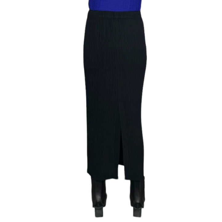 Pleated skirt with elasticized waistband and two side pockets. High slit at center back. Straight fit.