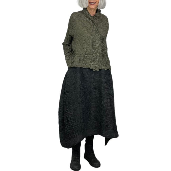 Horizontal pleat A-line skirt with an elasticized waistband and two side pockets.