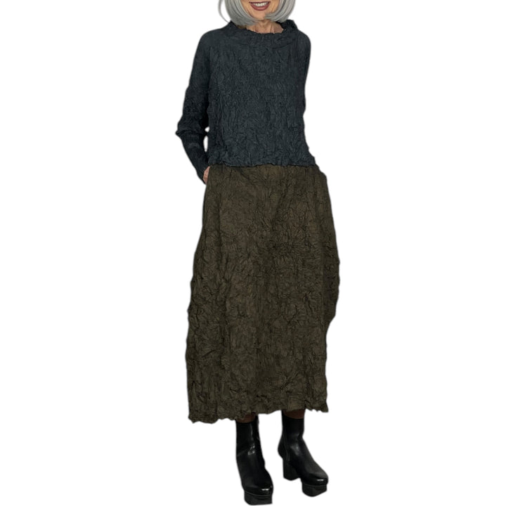 Solid crinkle pleated pull-on skirt with an A-line shape. Elasticized waistband and two side pockets.