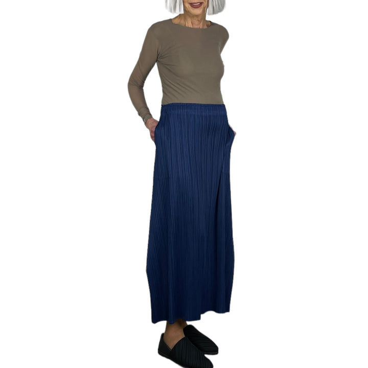 Pleated skirt with elasticized waistband and two side pockets. Flared shape with angular points at the calves for added side volume.