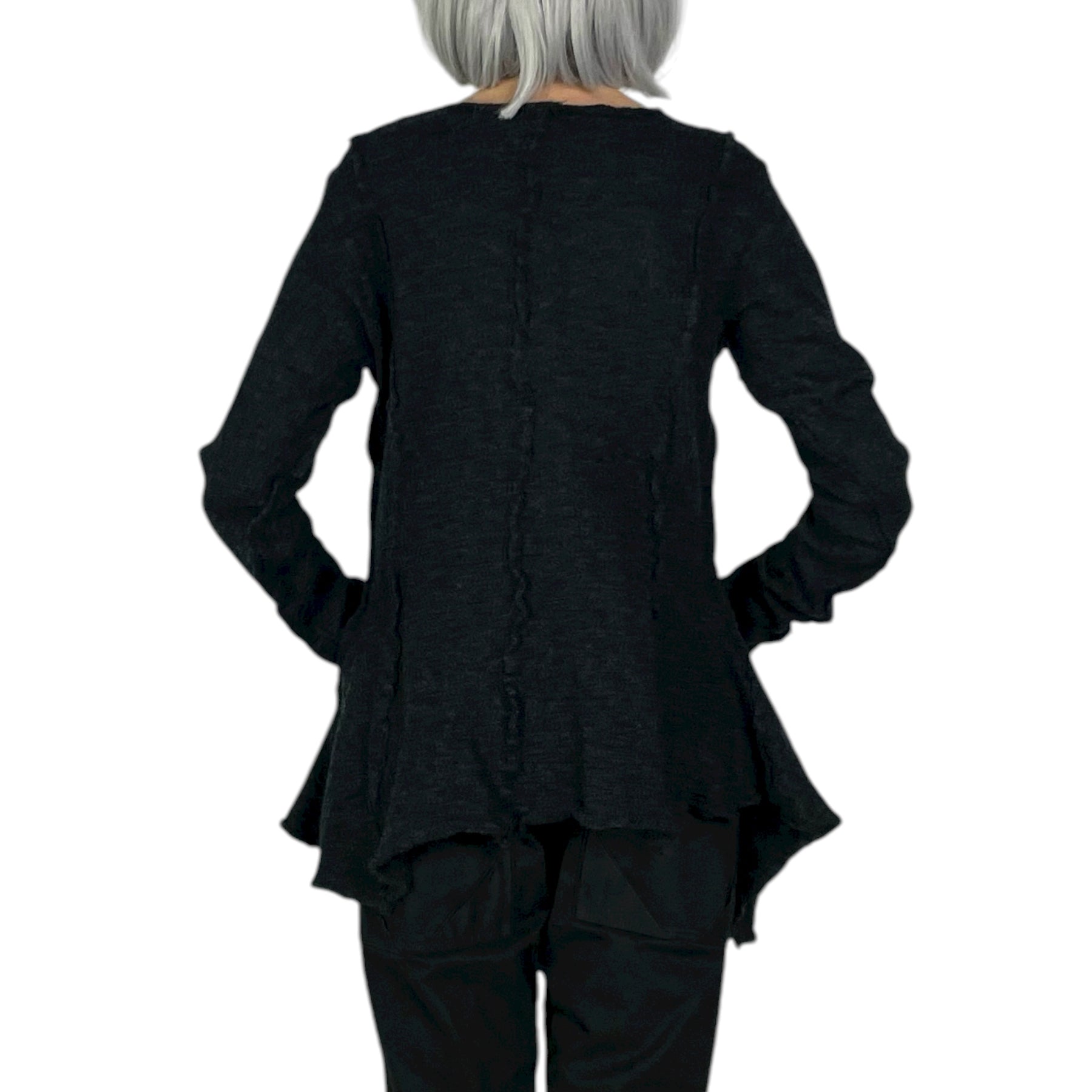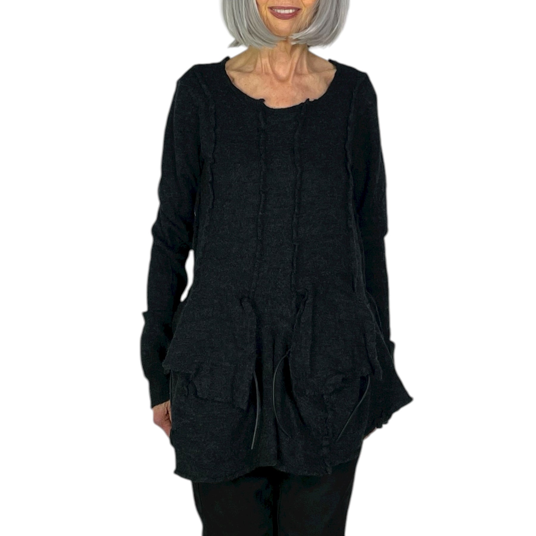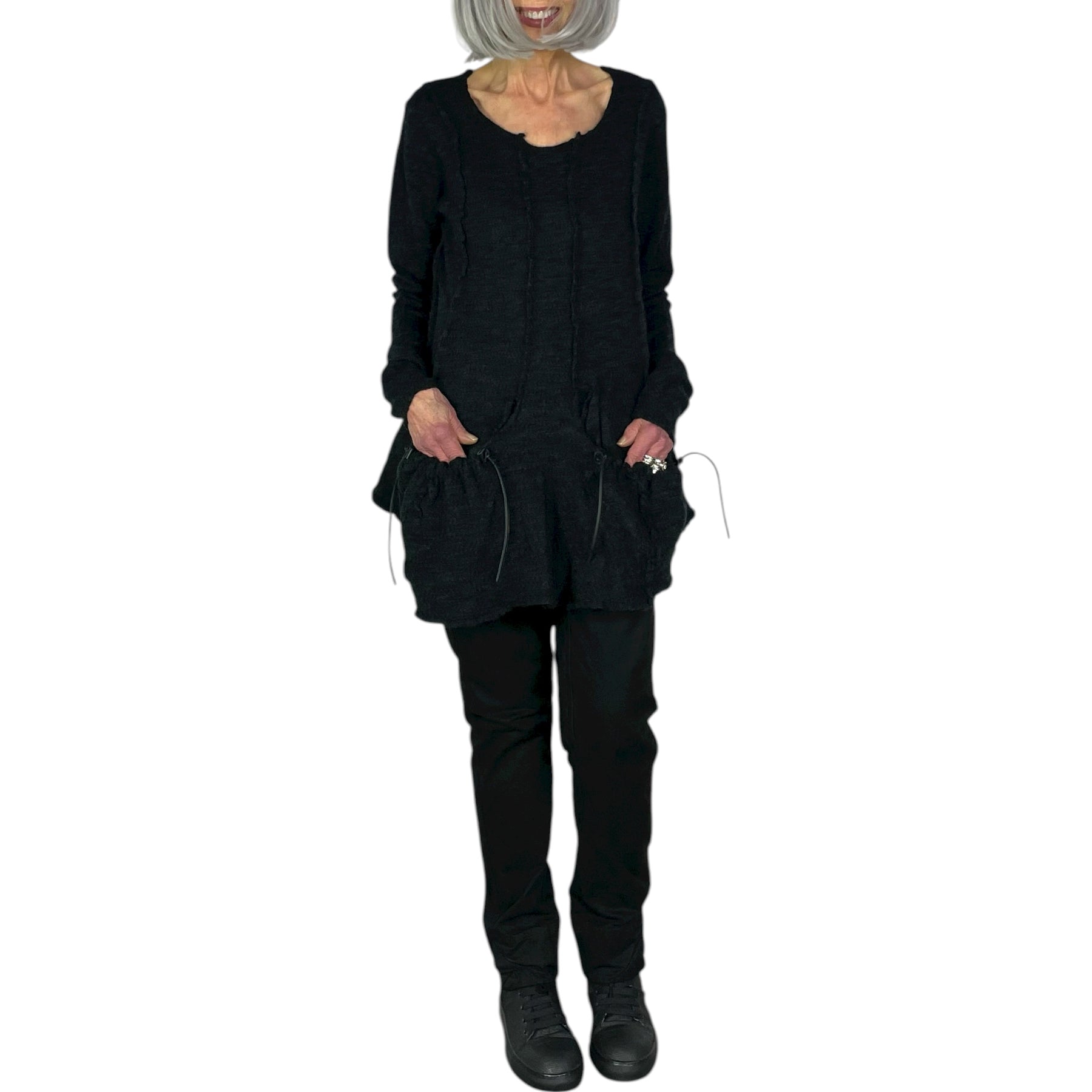 Long sleeve boiled wool sweater with a scoop neckline.  Two front pockets with leather drawcord and flaps. Inside-out seaming detail. Shaped silhouette.