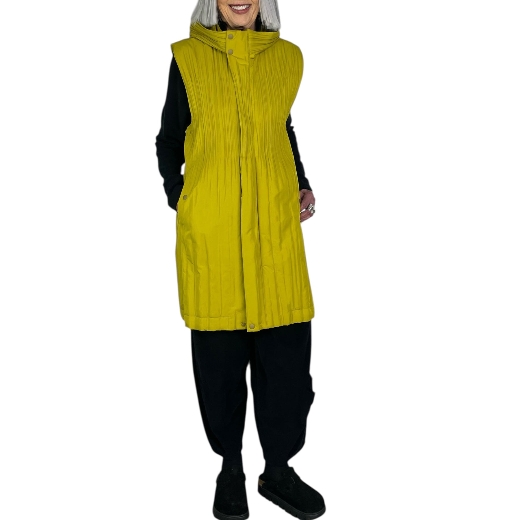 Hooded vest with zip front closure.  Snaps at neckline and hem. Two side pockets with snaps, drawcord at hem.