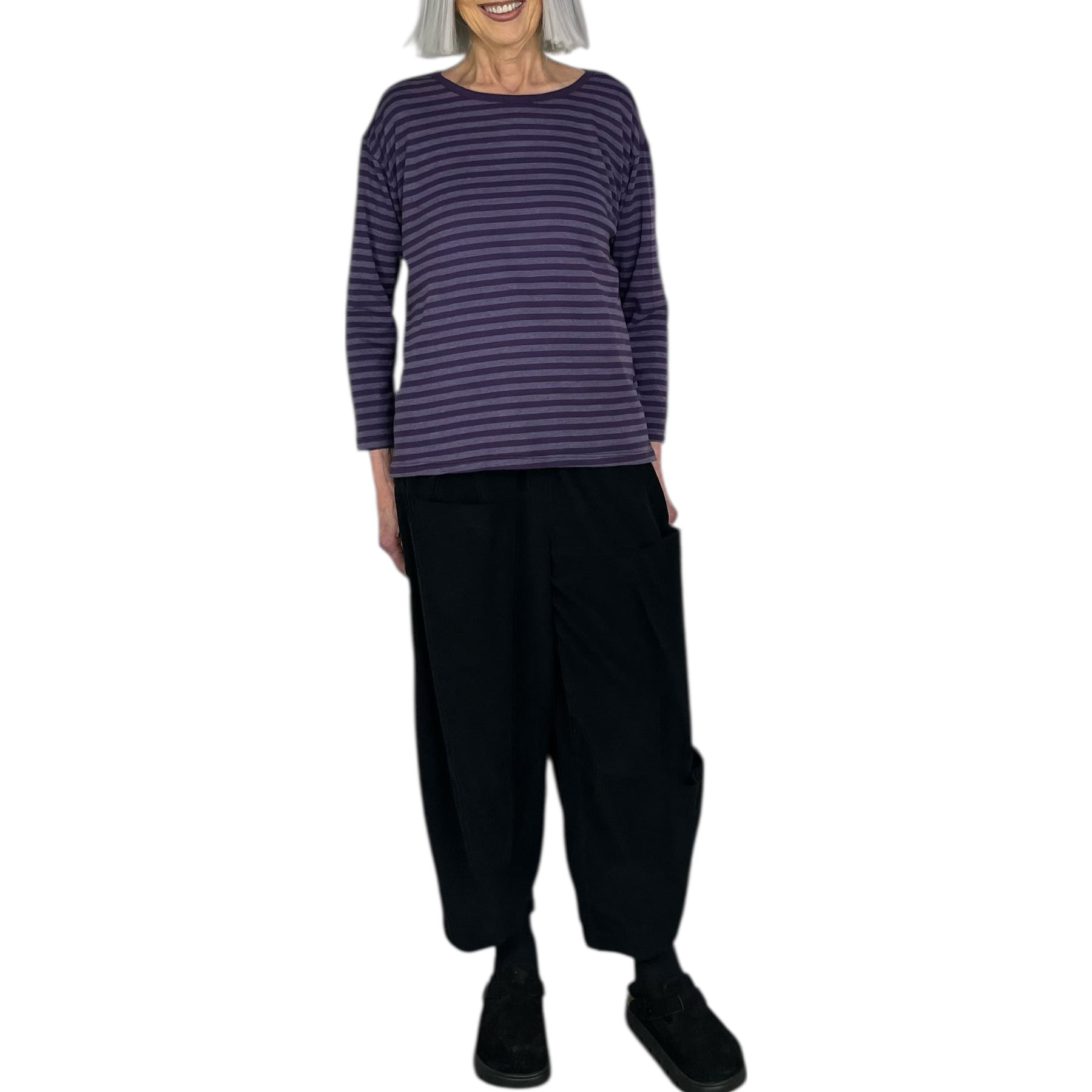 Long sleeve crew-neck t-shirt + 3". Tonal stripes and side slits, generous fit.