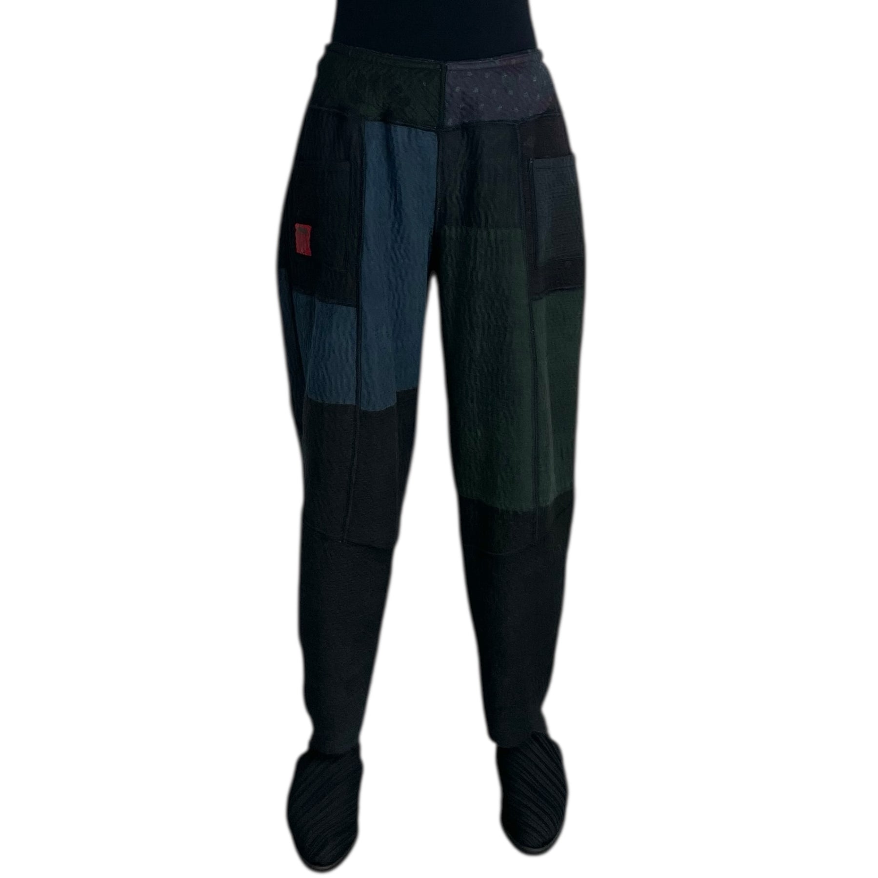 Reversible pull-on pant with elasticized waistband. Front and back pockets on front side, front pockets only on reverse. 3-layer vintage kantha with hand stitching throughout. Lantern shaped legs, relaxed fit.