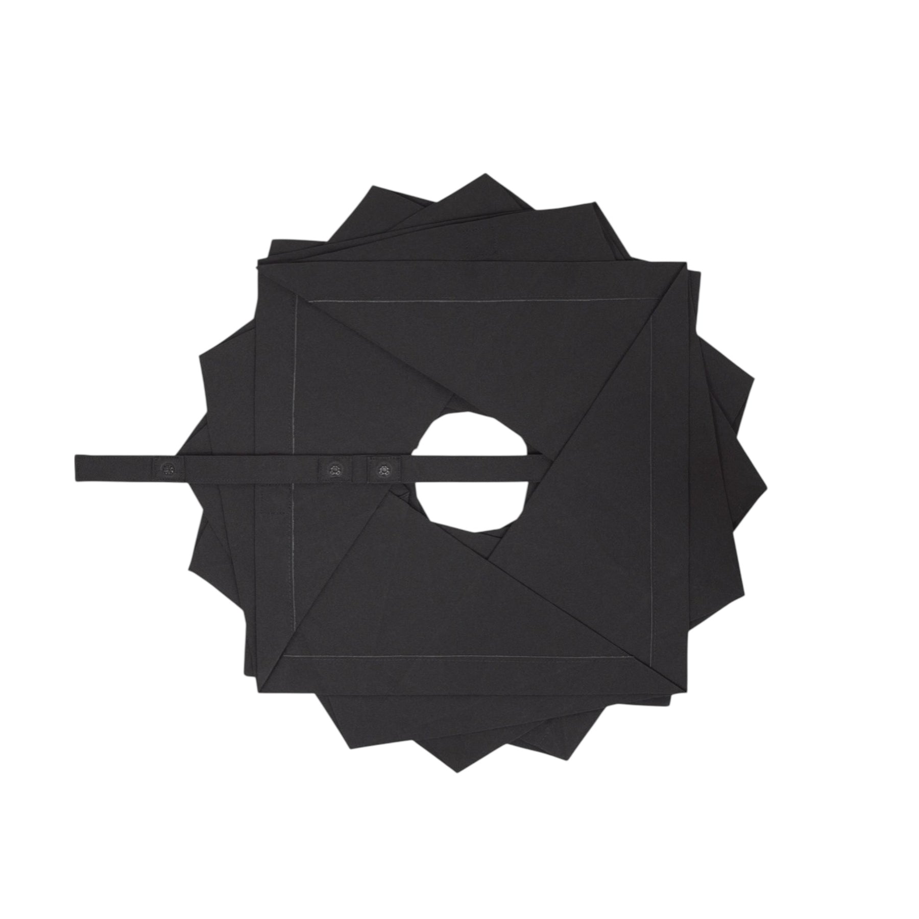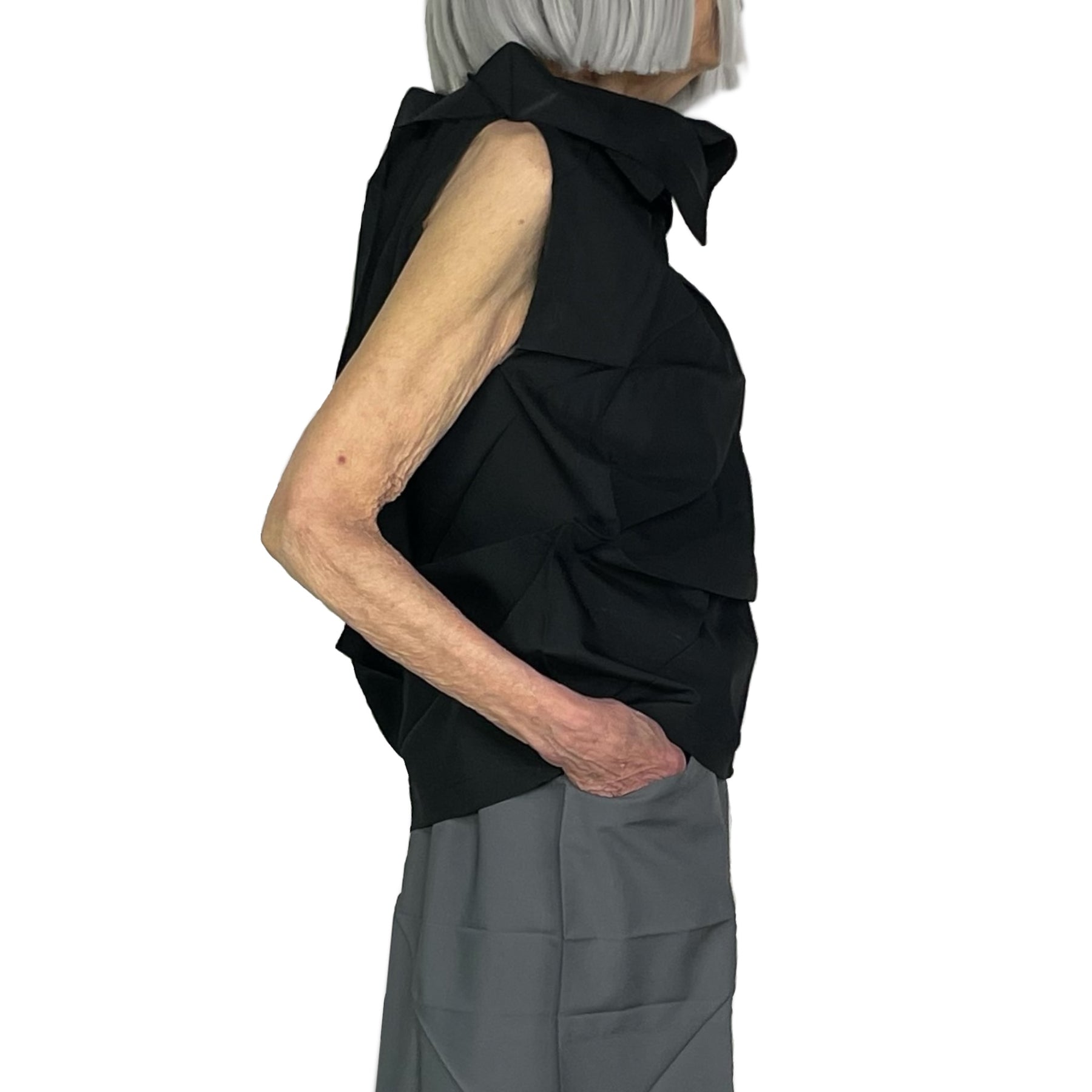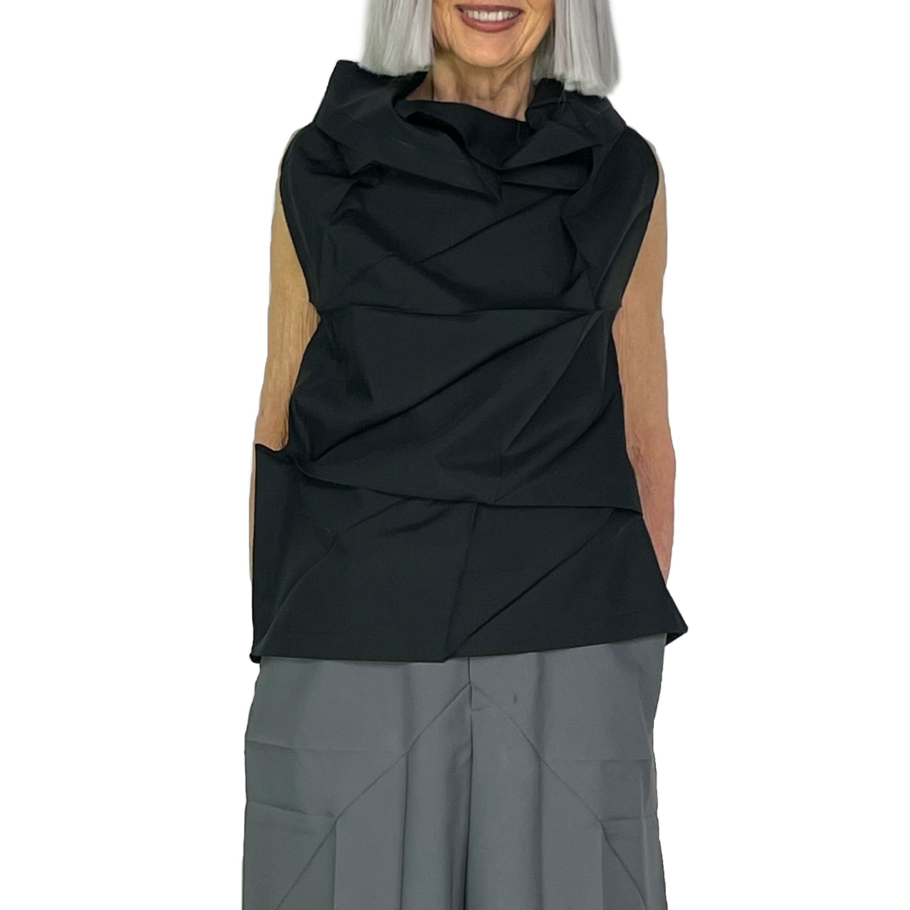 Sleeveless origami pleated top. Snaps at front neckline and snap tabs at back neckline. Designed to fold flat.