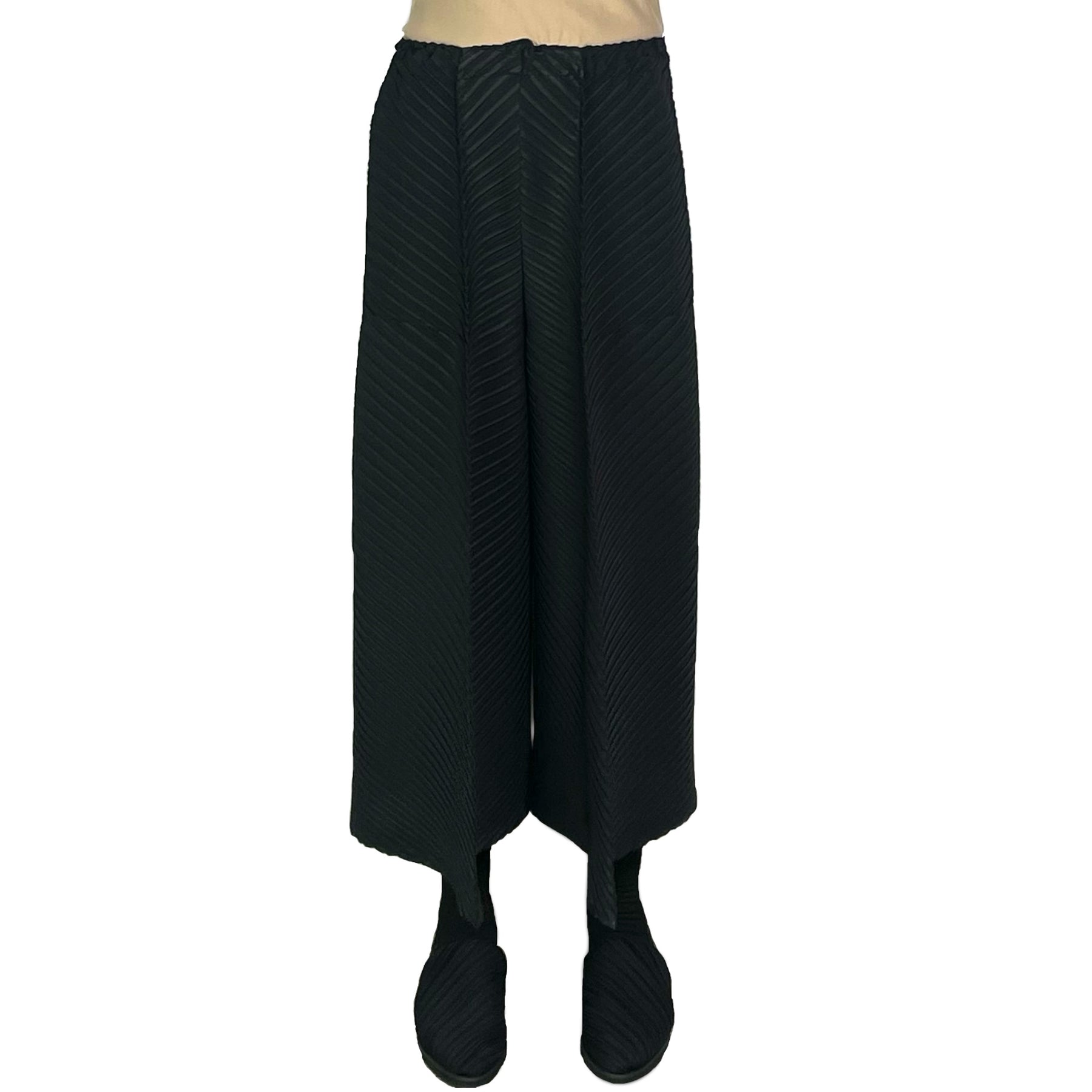 Wide leg pants with elasticized waistband and chevron pleats. Two side pockets.