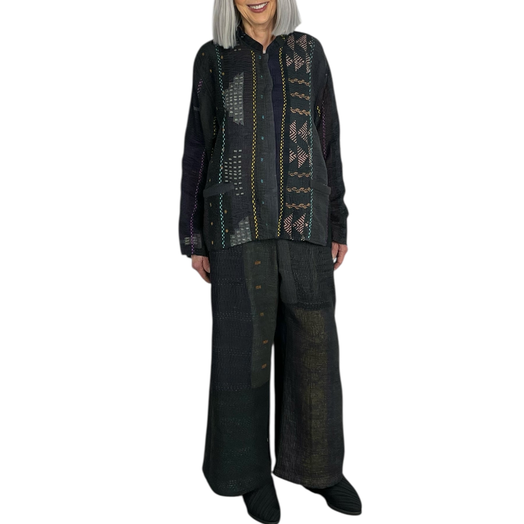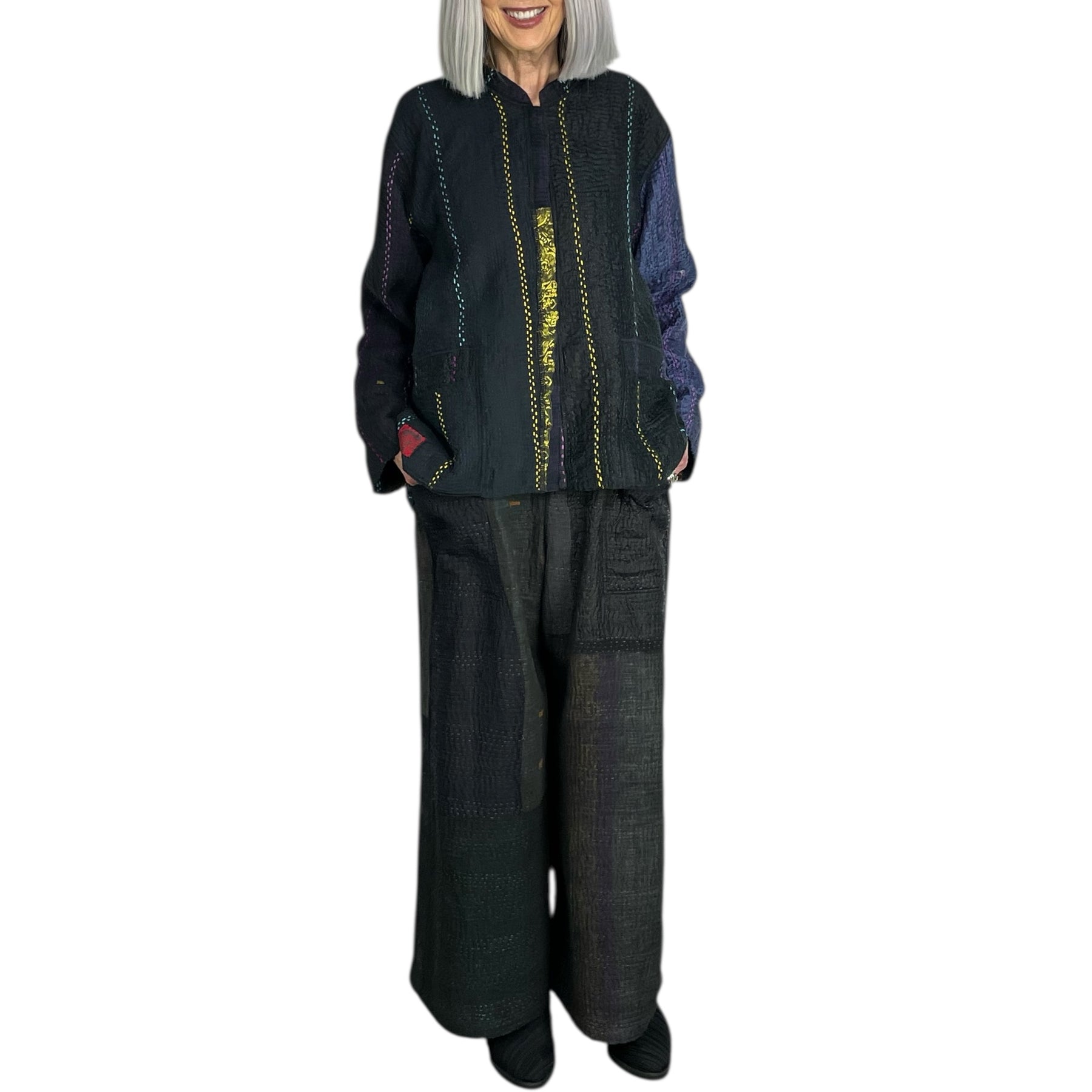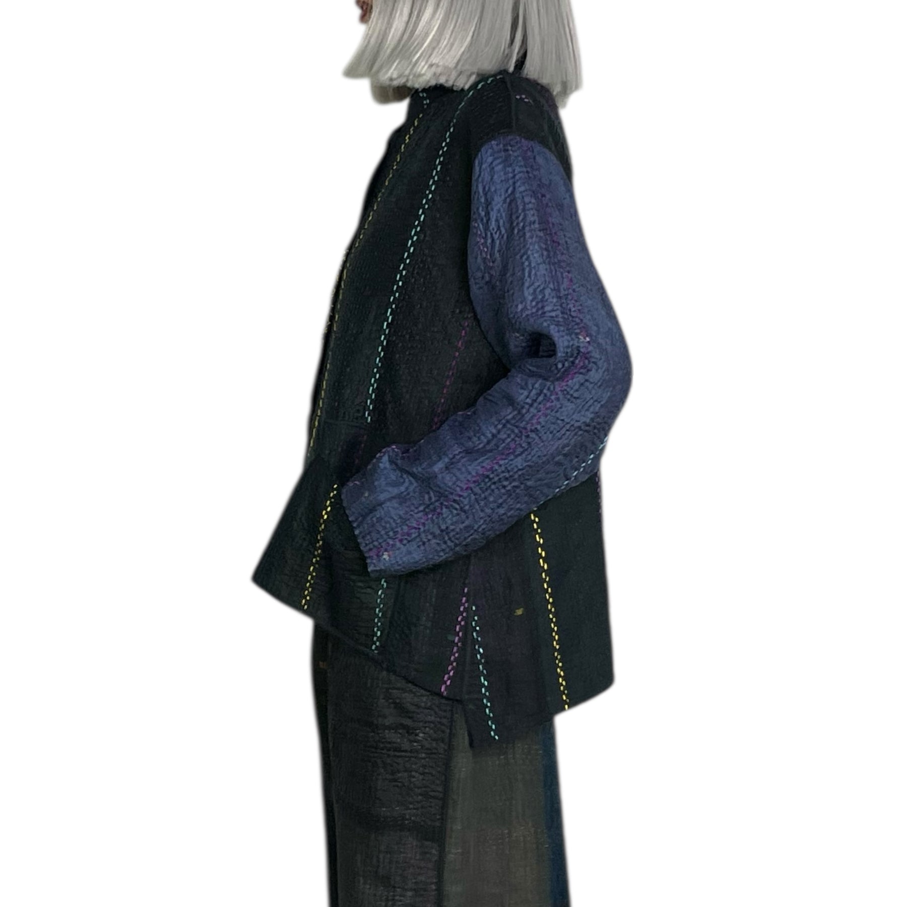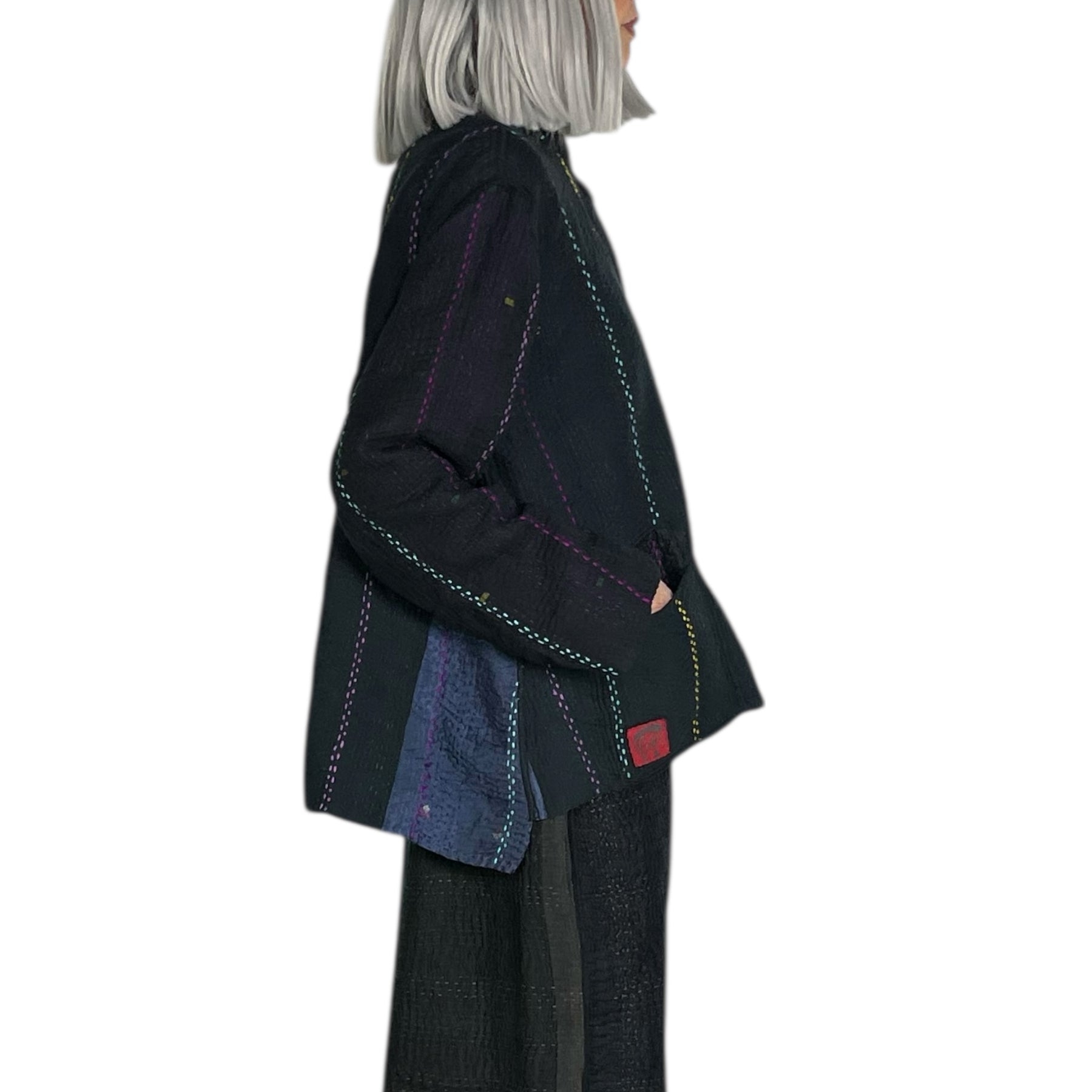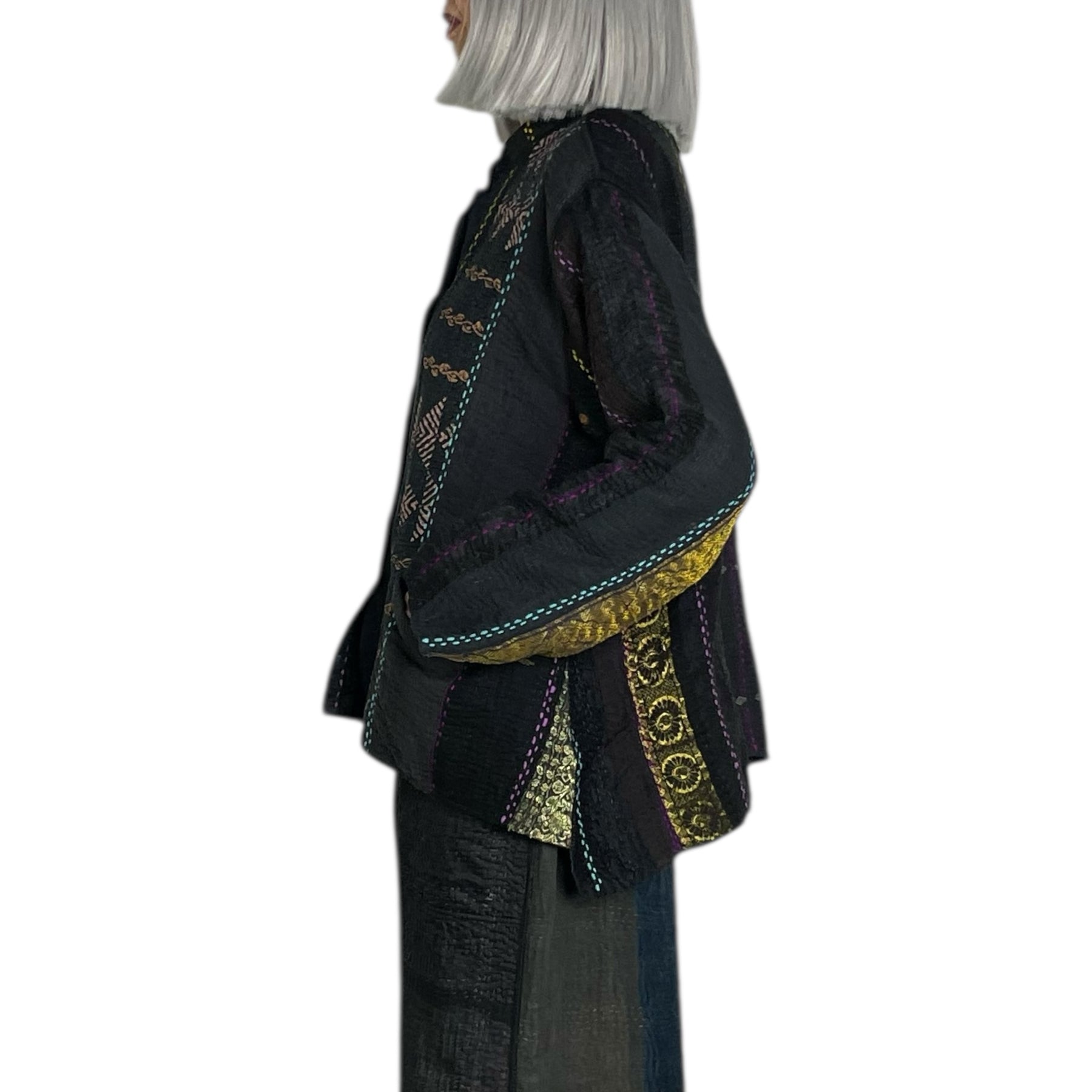 Reversible long sleeve vintage kantha jacket with a stand collar and snap front closure. Welt pockets on front side, patch pockets on reverse. Medium weight, jewel woven with vertical patches.  4-layer vintage saris with hand-stitching throughout. Relaxed fit, boxy silhouette. Hip length.