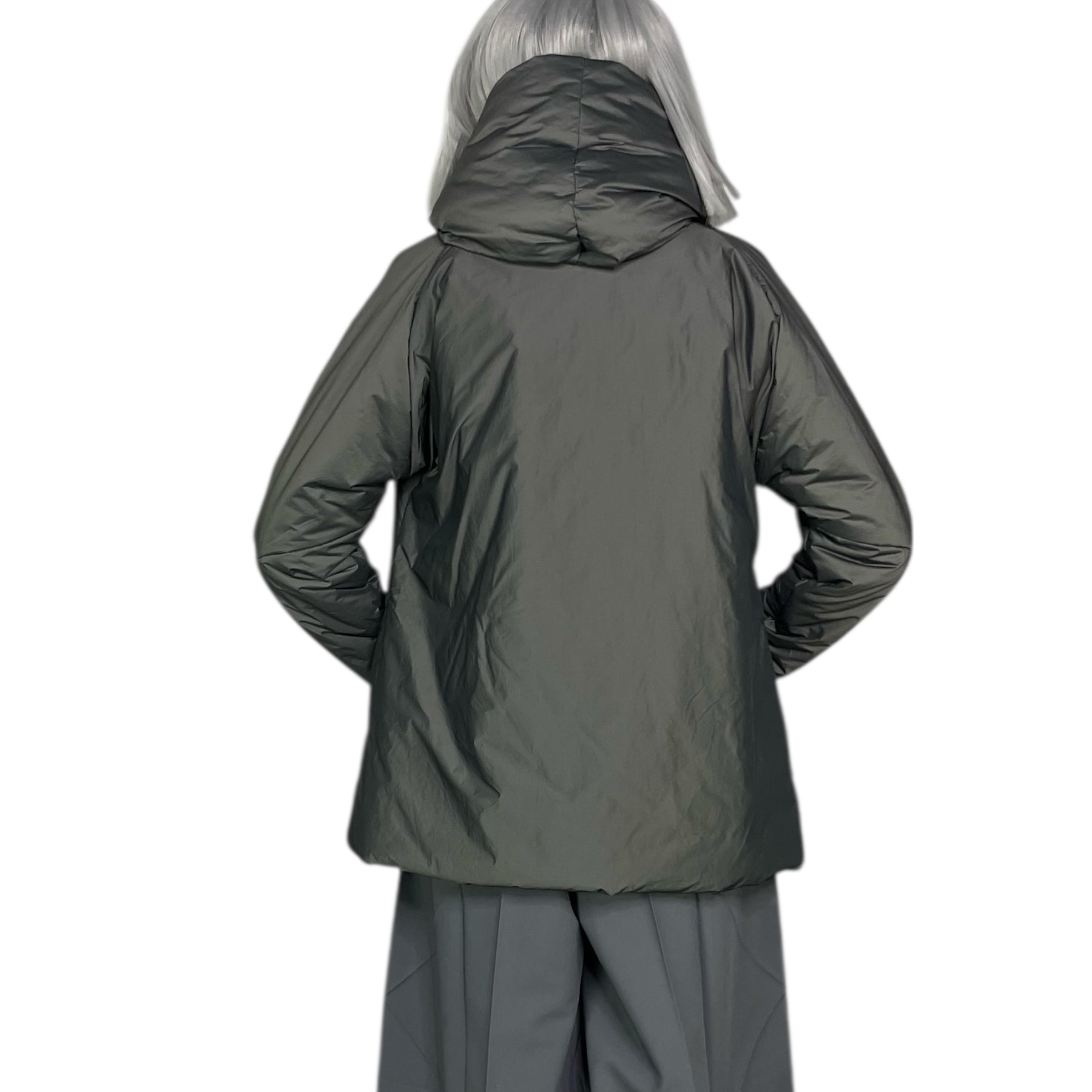 Long sleeve hooded puffer jacket with two front pockets and snap front closure.  Hip length.