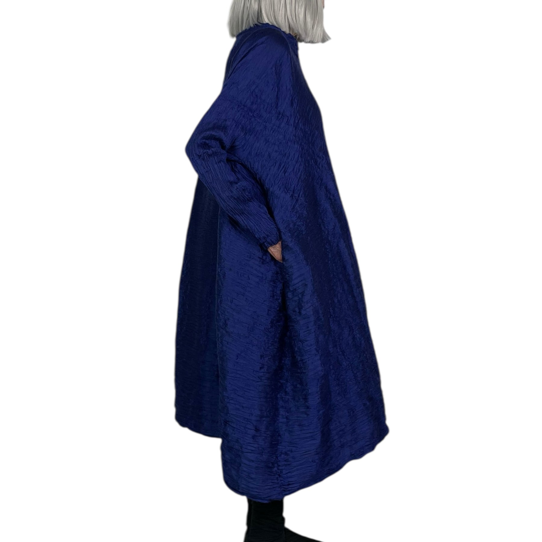 Horizontal pleated dress with a round neckline and long sleeves. Two side slit pockets. Wide asymmetric silhouette, oversized fit.