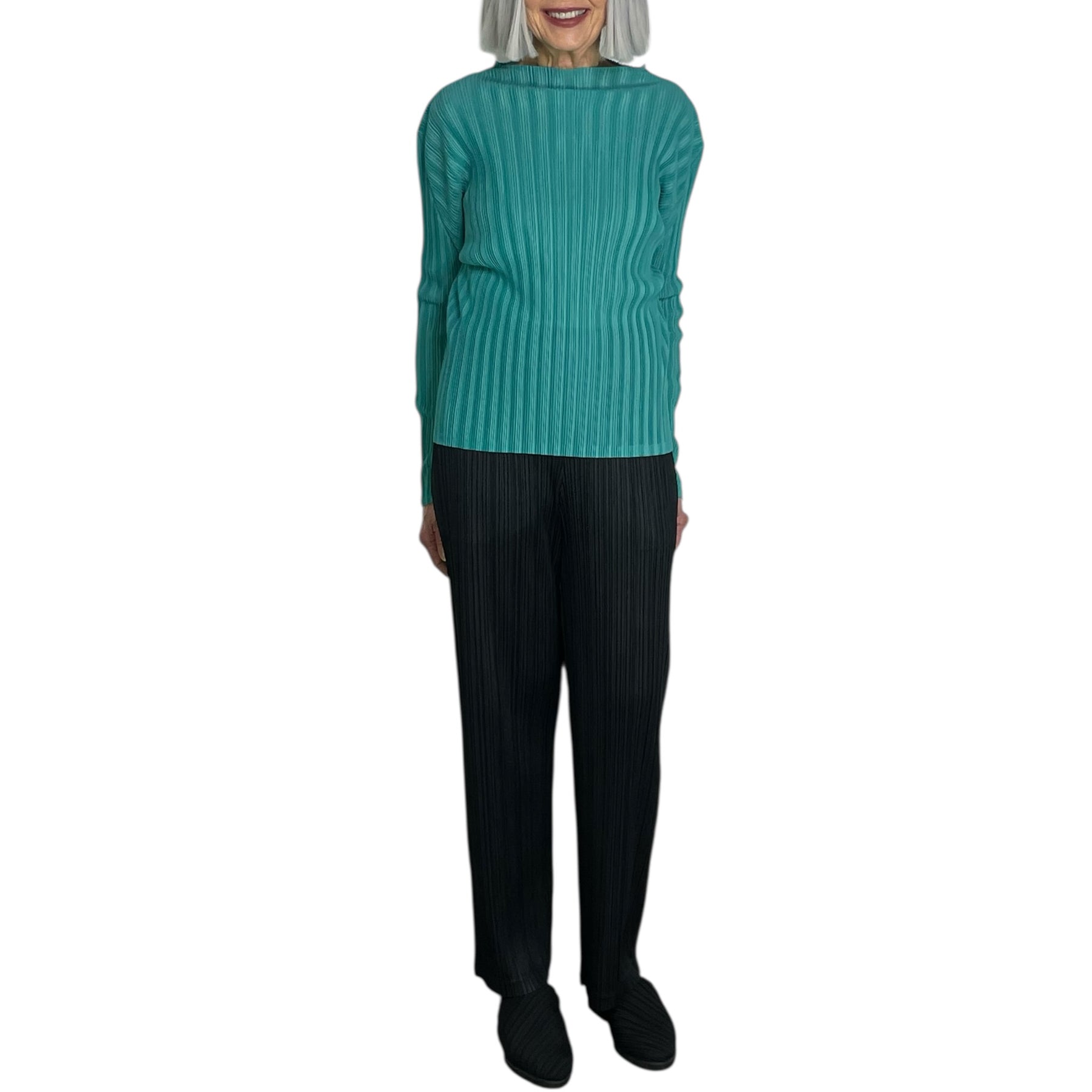 Mid-weight straight leg pant with elasticized waistband and two side pockets.