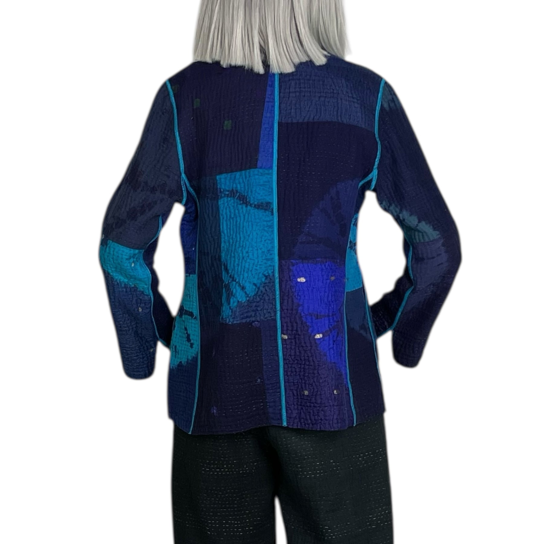 Reversible tie dye circle shibori jacket.  Long sleeves, stand collar and snap front closure. On seam pockets on front side, patch pockets on reverse. Slits at cuffs. Medium weight, 4-layer vintage saris with hand-stitching throughout. Classic fit, shaped silhouette.