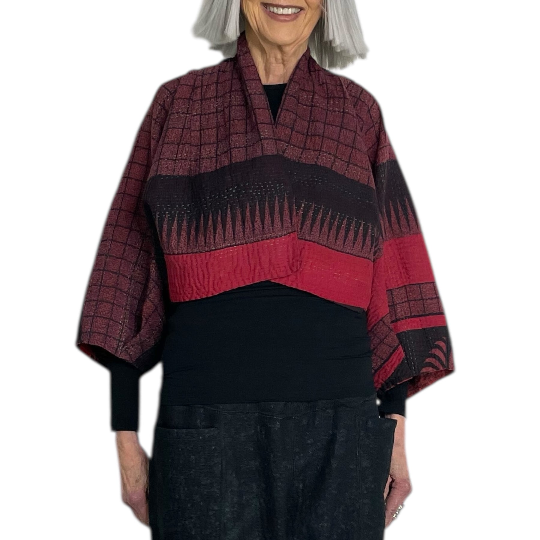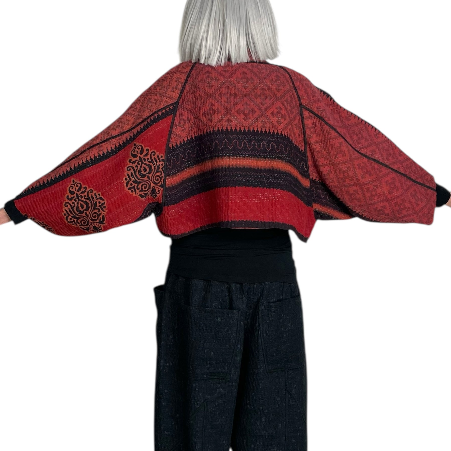 Reversible puff sleeve shrug with a kimono collar and 3/4 sleeves. 4-layer vintage saris with handstitching throughout. Overdyed vintage cotton on both sides.  Relaxed, boxy fit.