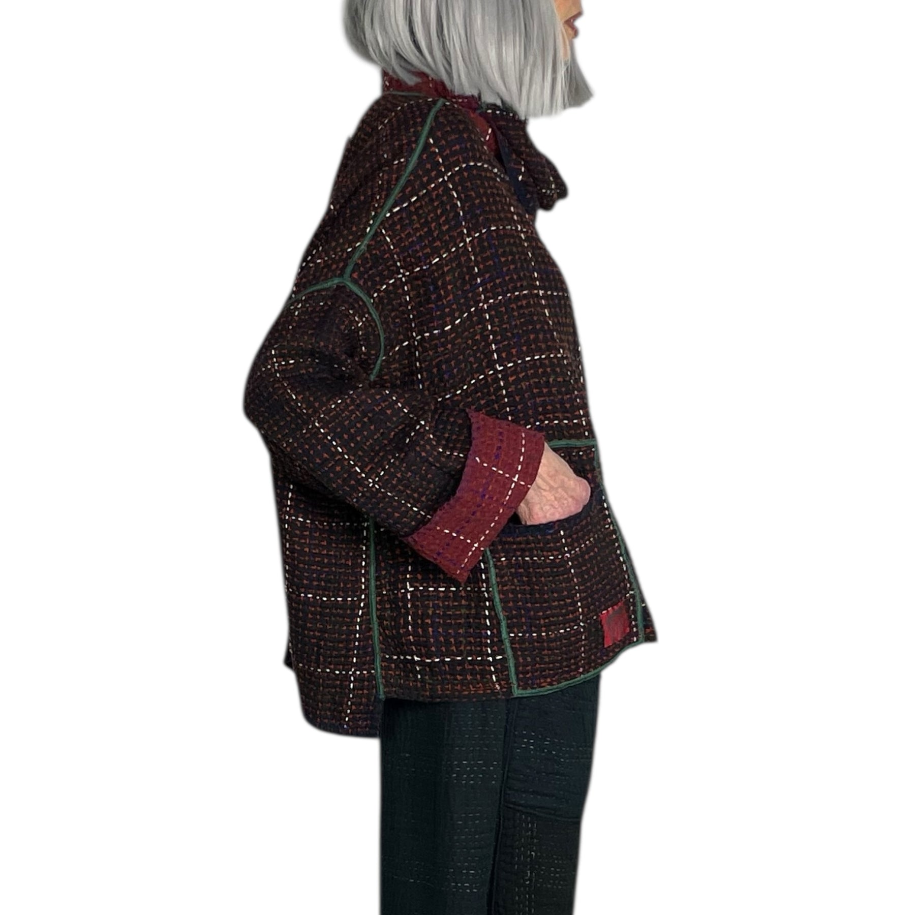 Over-dyed waffle plaid stitched reversible long sleeve cowl neck top.  Two welt pockets on front, patch pockets on reverse.  3-layer vintage saris with hand stitching throughout. Oversized, boxy fit.