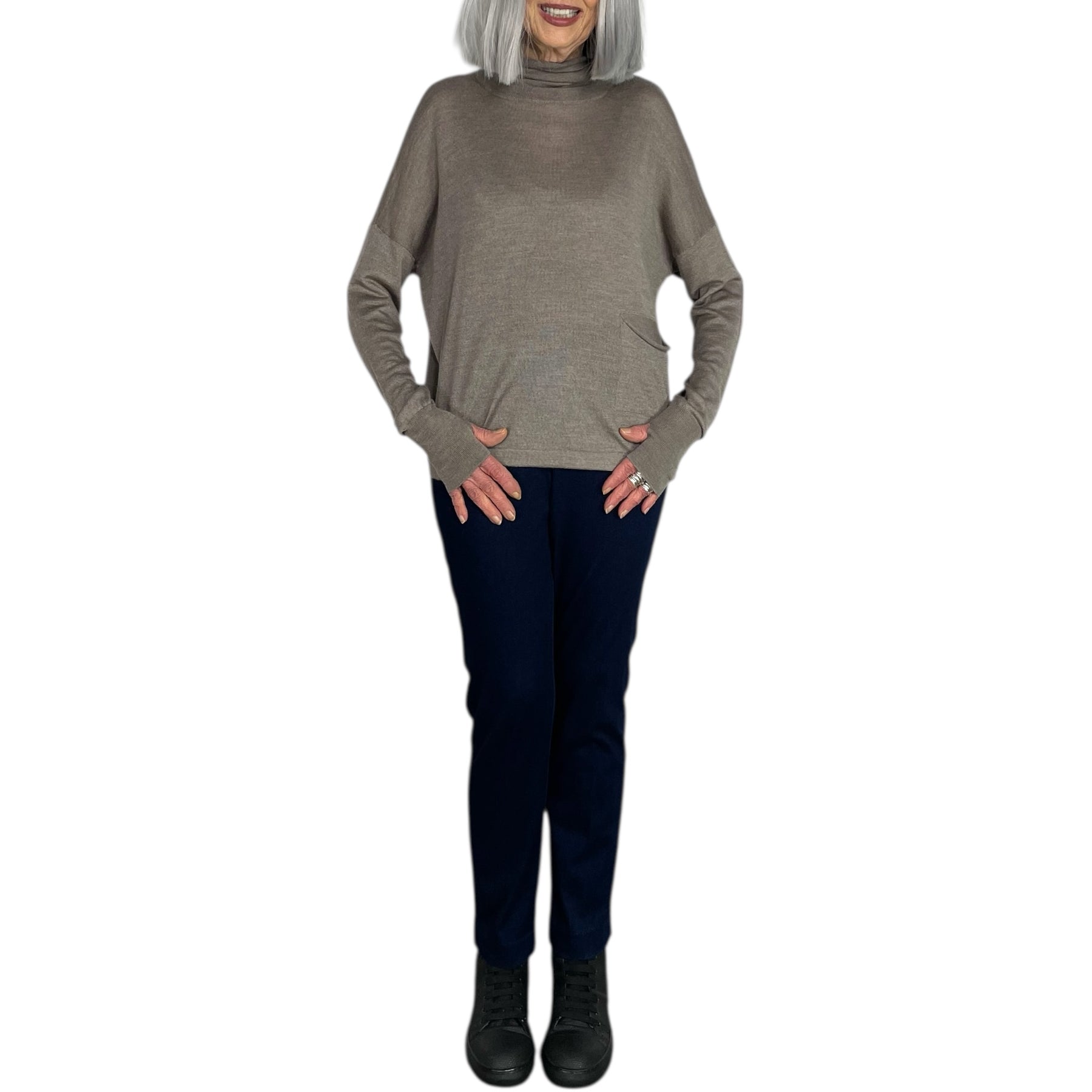 Fine gauge knit turtleneck with single rolled edge front pocket. Drop shoulders and long sleeves with thumb slits at ribbed cuffs. Side slits. Relaxed fit.