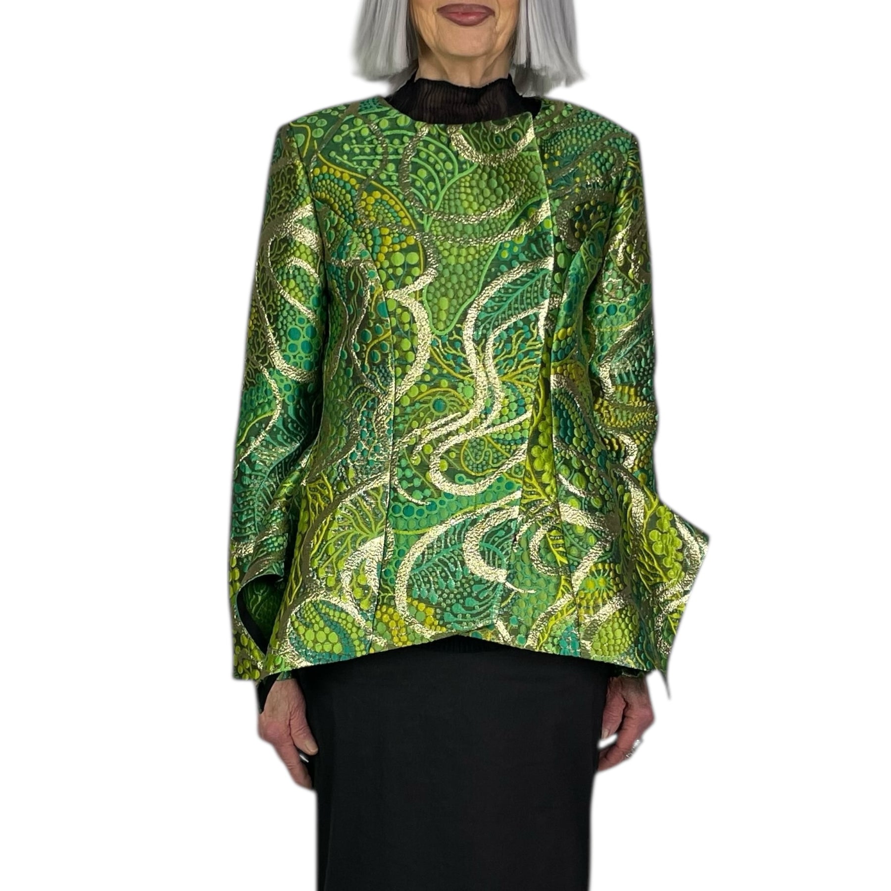 Long sleeve brocade jacket with a round neckline and off-center zip front closure. Shaped silhouette with peplum.