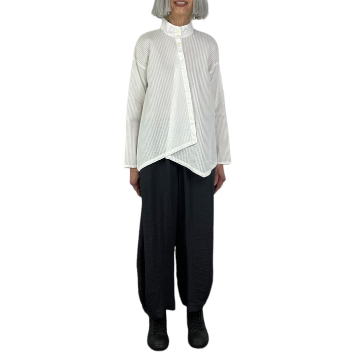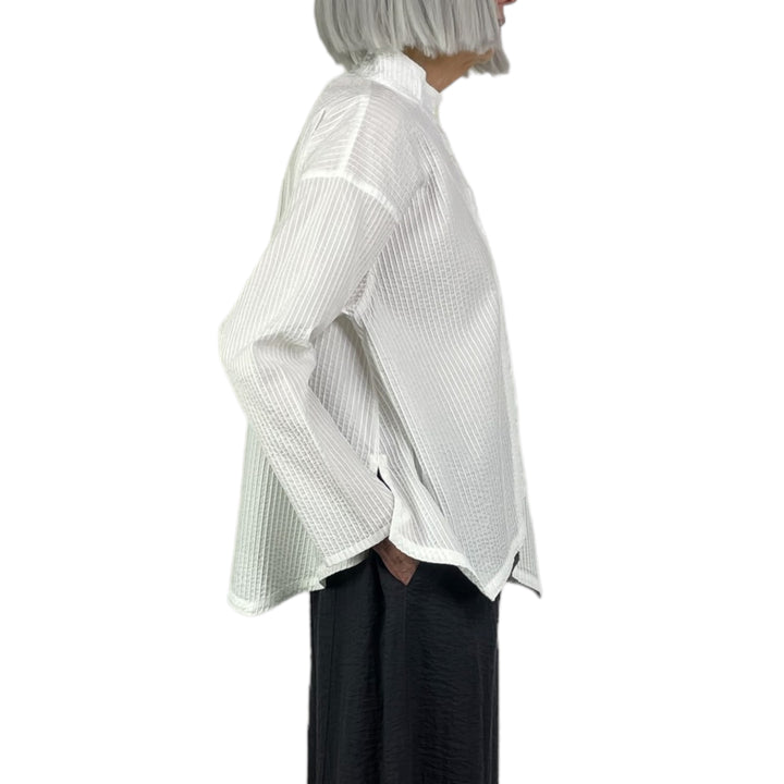 Long sleeve banded collar shirt with drop shoulders. Three exposed buttons at top of button placket. Overlapping front panels with asymmetric hemline. Slit detail on back of collar and sides. Signature hand-worked pintucking.