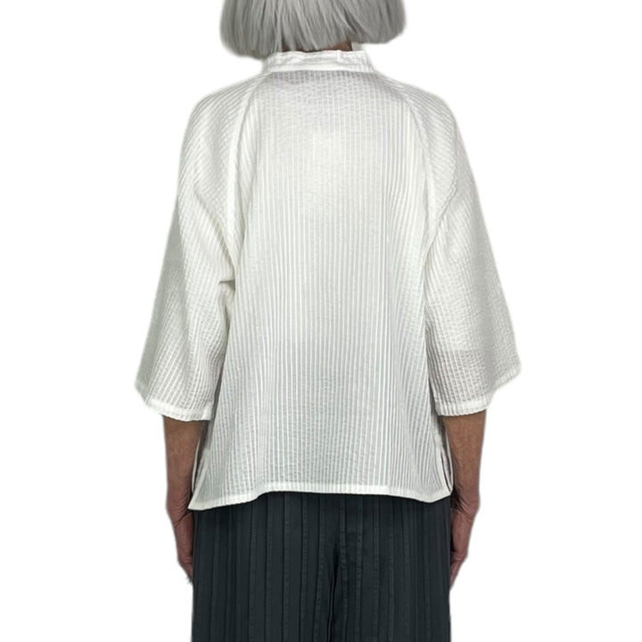 Stand collar button front shirt with 3/4 sleeves, side slits and signature pintuck striping.