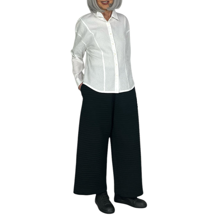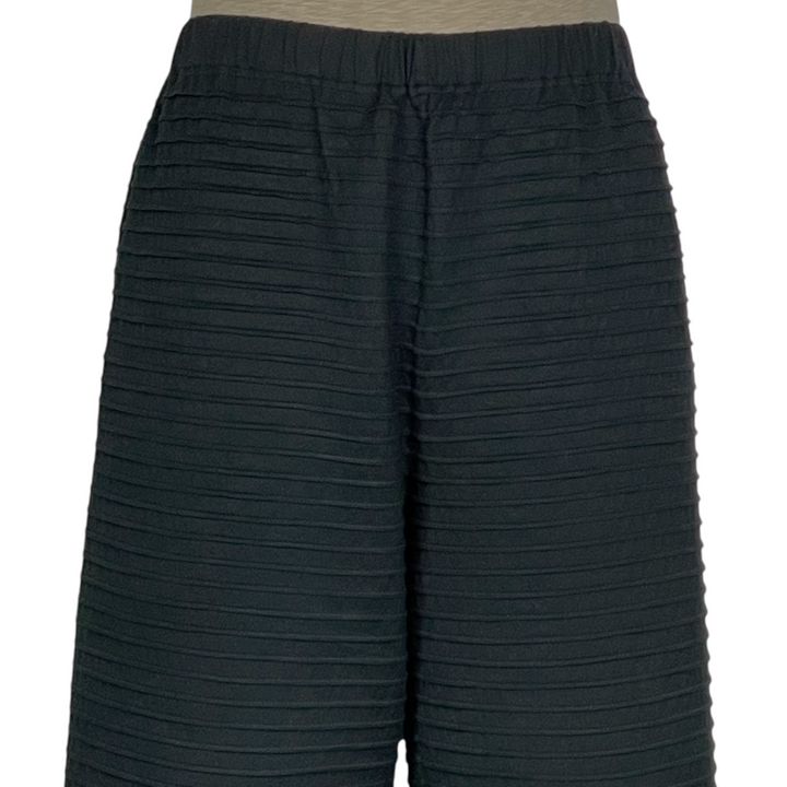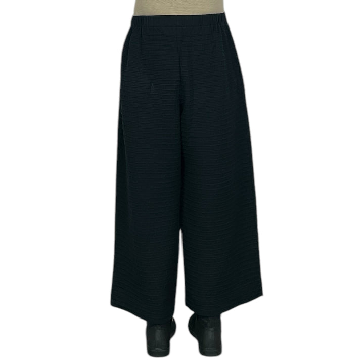 Pull-on wide leg pant with elasticized waistband and two side pockets. Horizontal pintucked cotton jersey.
